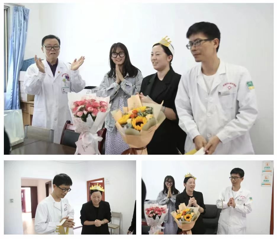 在同事们的见证下,张国丽主任与赵德良主任接过鲜花站在蛋糕前,眼中闪烁着感动的光芒。