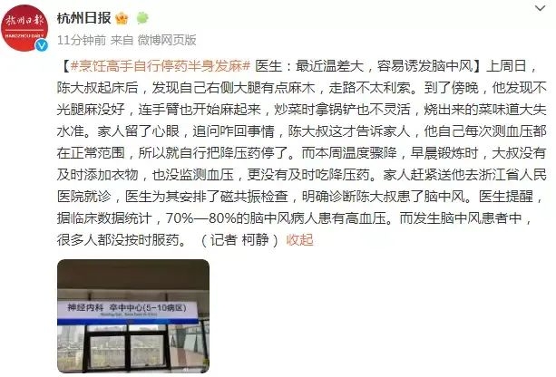 夏天中老年人出汗多,导致血容量减少,血液黏稠度增加,对患有高血压的患者来说,发生中风的几率增高。不仅如此,最近温差大,也容易诱发脑中风。